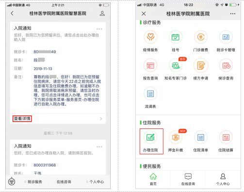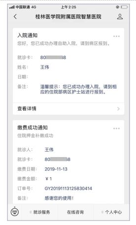 也就是说,医生开具电子住院证后,患者或家属不用下楼排队办理入院手续,只需关注"桂林医学院附属医院智慧医院"微信公众号,绑定就诊卡,就可以完成入院手续了。