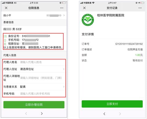 第三步:请仔细核对患者相关信息是否无误(非常重要),并填写代理人(即家属)信息,点击“立即办理入院”,预交住院押金(限微信支付)