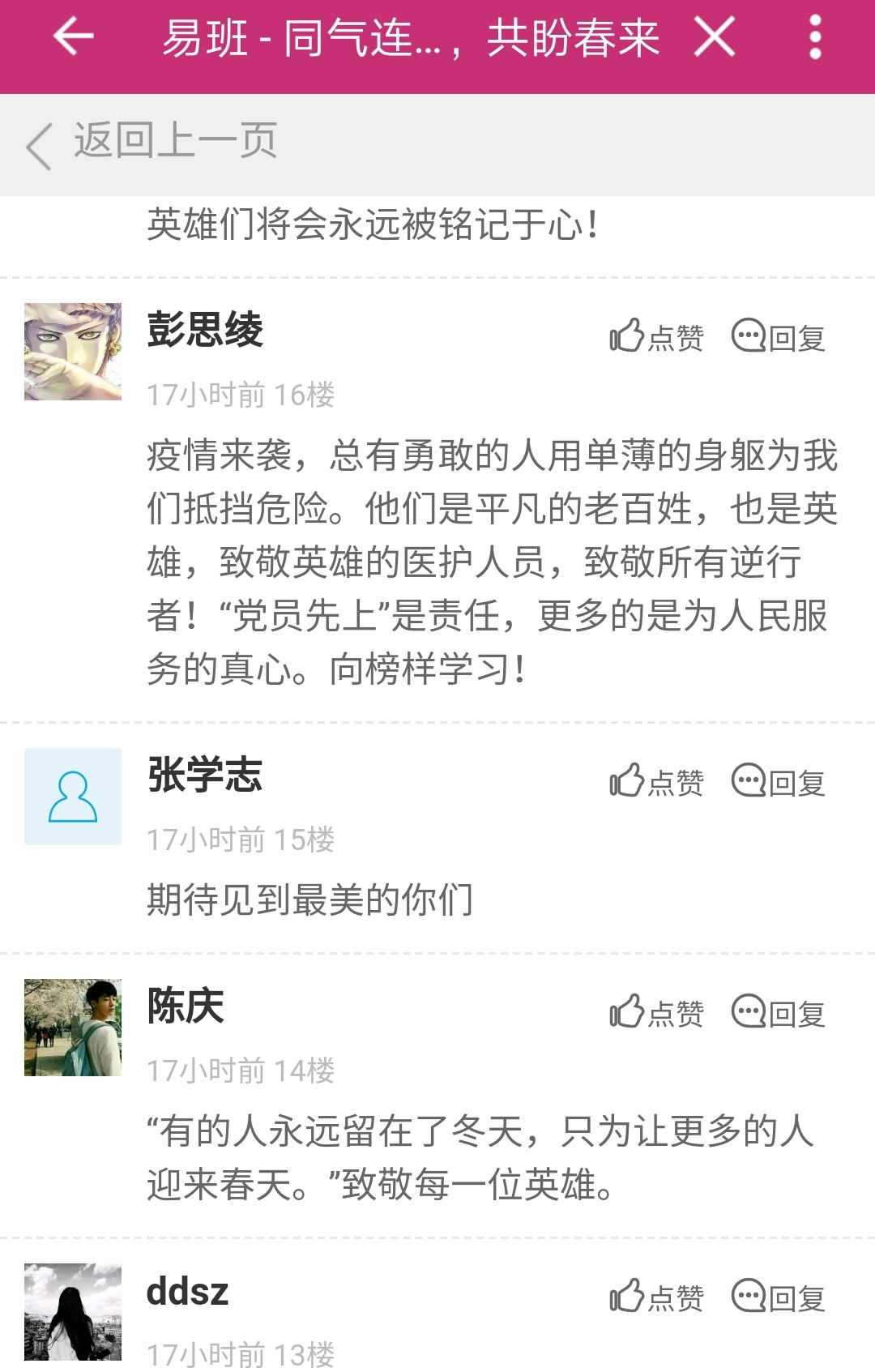 推进新冠肺炎疫情防控工作,宣传疫情期间的英雄事迹,鼓励青年党员、预备党员和入党积极分子学习其不畏艰难无私奉献的精神,4月11日,在党支部书记黄艳芸老师的带领下,同时结合检验易班的“轻应用”举办“共战疫致英雄——同气连枝共盼春来”线上活动。活动中,大家积极发表自己对抗击疫情的决心以及对疫情期间守护人民生命健康的英雄表达致敬。