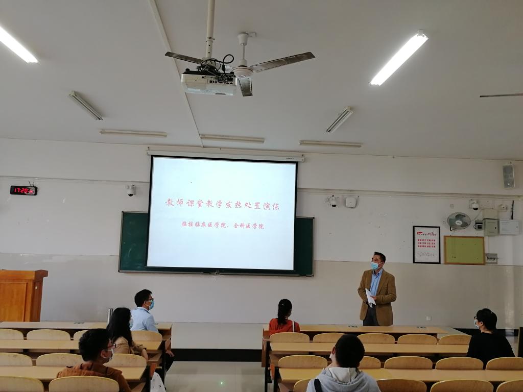 为充分做好2020年春季开学准备,维护疫情防控期间正常教学秩序,4月15日下午,临桂临床医学院(全科医学院)在临桂校区教学南楼组织开展教师课堂教学过程中学生发热处置演练。副院长蒋晓山全程观看演练,全体教师、教学管理部、学工办等人员参加演练及观摩。