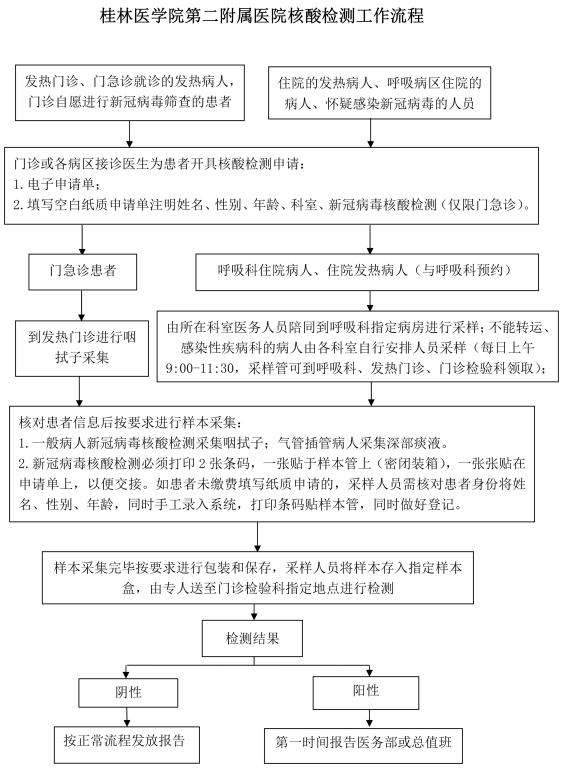 经自治区、市相关部门同意,自5月1日起,第二附属医院可开展新冠病毒核酸检测工作。为全力配合复工复产复学,加快提高检测能力,既对重点人群做到“应检尽检”,又对复工、复产、复学中人员聚集的单位、场所优先做到“想检就检”“随时来检”,医院收到批复后立即开放新冠病毒核酸检测,尽全力为广大人民群众提供便捷、满意、优质的医疗服务。