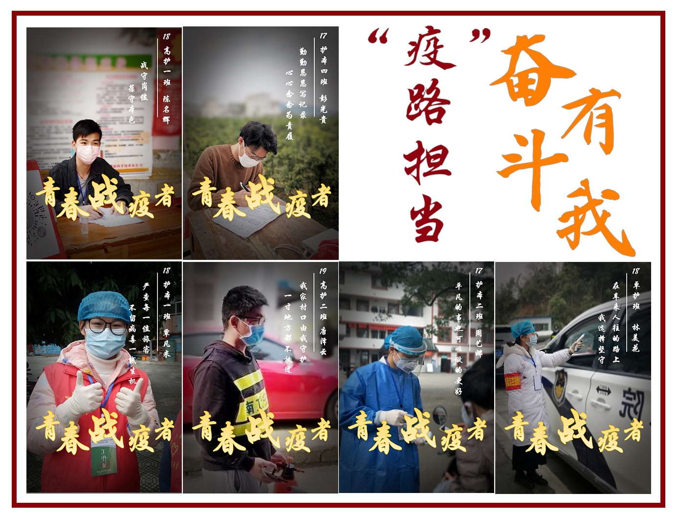 新冠肺炎疫情期间,护理学院35名青年学子积极投身基层联防联控志愿服务活动,以实际行动践行“疫路担当,奋斗有我”!护院学子拍摄的原创视频《五四精神,传承有我》讲述护院学子在社区服务、课堂宣教、车站志愿等方面的抗“疫”历程,记录他们在疫情防控阻击战中的青春印记,他们换上最靓丽的志愿红,以最坚定的意志、最无畏的气概,奋战在家乡和学校疫情防控的第一线,让青春在党和人民最需要的地方绽放绚丽之花。