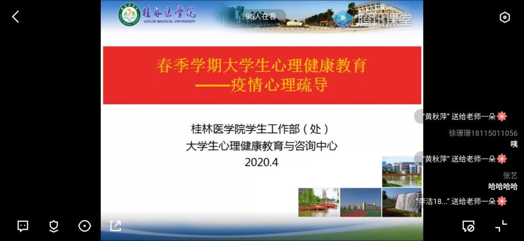 年初,新型冠状病毒来势汹汹,抗击疫情刻不容缓。为帮助同学们正确认识新冠肺炎疫情,缓解内心焦虑,保持心理健康,从2020年4月26日到5月5日期间,在学工处和公共卫生学院指导下,全体辅导员通过腾讯课堂,组织同学们开展“春季学期大学生心理健康教育--疫情心理疏导”主题班会。