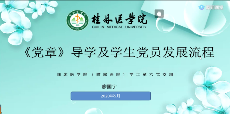 5月7日,临床医学院学工第六党支部运用网络新媒体,开设线上党课。党支部书记廖国宇以《中国共产党章程》为主要内容,为入党申请人、积极分子、发展对象、支部党员等183名同学进行授课。加深了入党申请人和积极分子对中国共产党的了解,明确了入党流程和注意事项,增强了同学们的爱国热情,坚定了他们的入党决心。