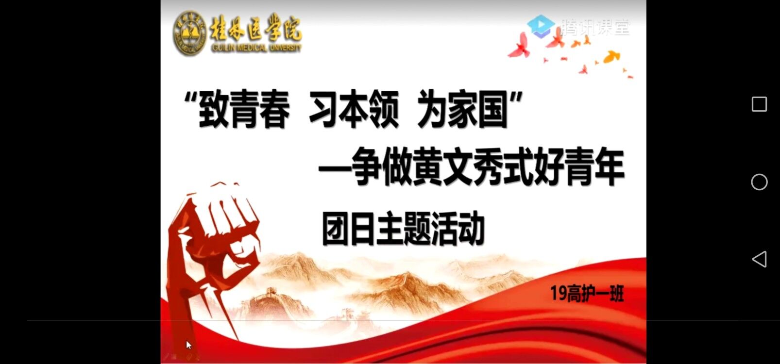 为了深入学习领会习近平总书记2020年五四青年节寄语精神,落实区党委鹿心社书记给西部计划都安瑶族自治县服务队全体志愿者的回信精神,激励团员青年争做有理想、有本领、有担当的黄文秀式好青年,19高护1班团支部唱响主旋律,于5月12日通过腾讯课堂平台开展“致青春,习本领,为家国——争做黄文秀式好青年”线上主题团日活动。班主任张在平、胡水华、辅导员李娟、班助李雨晴与全班163名同学参与了这次活动。