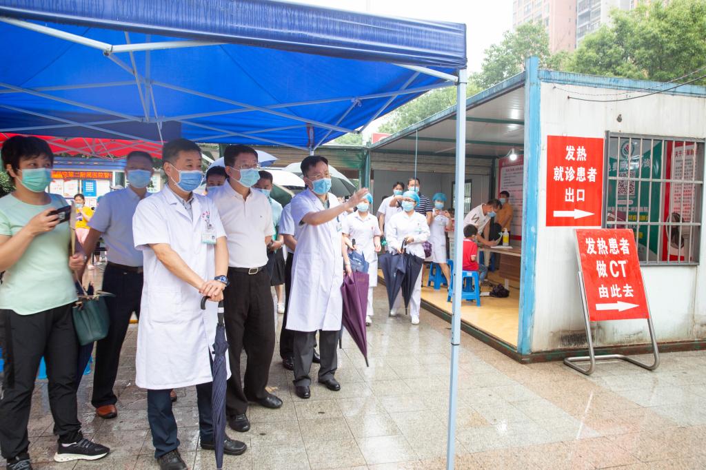 汇报结束后,李滨一行来到门诊楼,详细了解发热门诊预检分诊工作流程和接诊情况。李滨对第二附属医院贯彻落实《传染病防治法》和国务院《突发公共卫生事件应急条例》相关工作以及完善的发热病人就诊流程给予了充分肯定,他要求医护人员发挥专业优势,做好疫情防控工作;叮嘱医护人员做好自身防护,确保以良好的状态抗击疫情,守护好人民群众身体健康和生命安全。