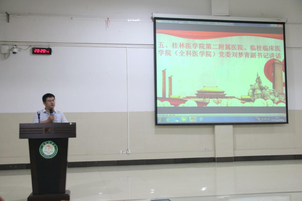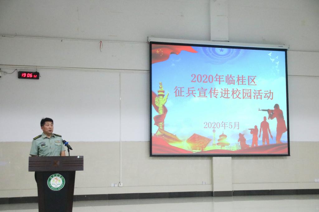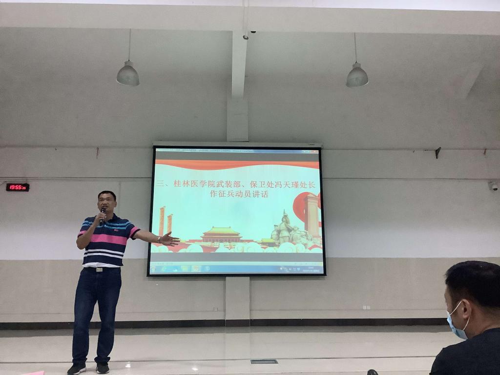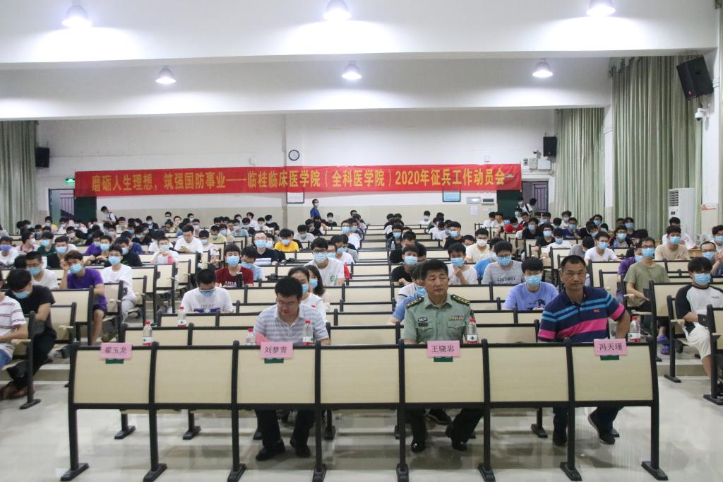 为了增强同学们对征兵政策的了解,提高同学们报名参军的积极性,桂林医学院临桂临床医学院(全科医学院)于2020年5月28日19:00在临桂校区南楼多功能报告厅举办2020年征兵工作动员会,桂林市临桂区武装部政委王晓忠,桂林医学院武装部、征兵工作站站长冯天瑾,桂林医学院第二附属医院、临桂临床医学院(全科医学院)党委副书记刘梦青出席了本次动员会,临桂临床医学院(全科医学院)临桂校区在校学生到场聆听动员会。