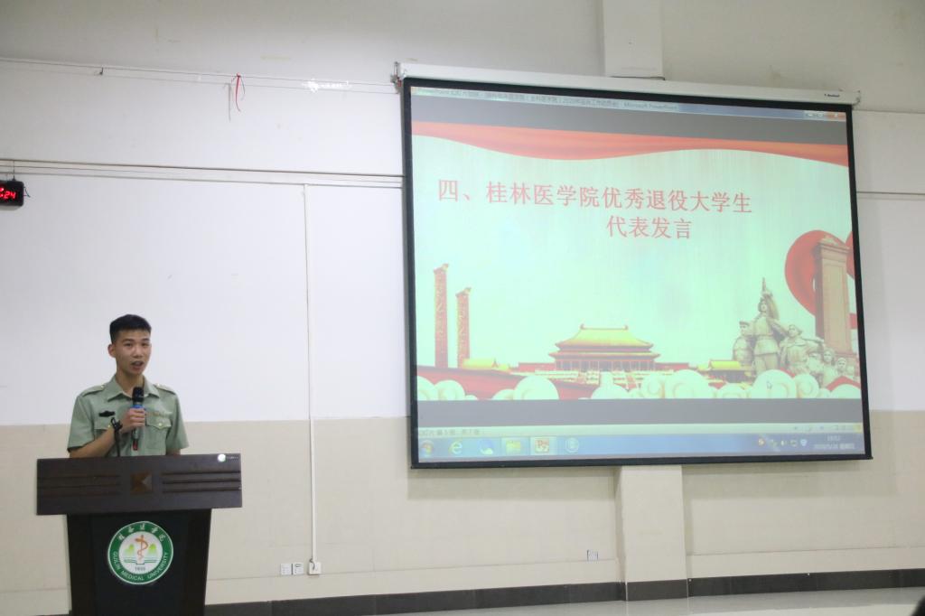 会上,桂林市临桂区武装部政委王晓忠结合当前的形势和实际工作经历,向同学们介绍了目前军队的建设和征兵政策,让同学们了解了丰富的军队知识和最新的士兵待遇,使同学们受益匪浅。此外,王政委结合近期的抗疫工作,重点介绍了军队中优秀医务工作者的先进事迹,号召同学们向他们学习,报名参军报效祖国。王政委热血澎湃的宣讲和针对目前国际形势的一番肺腑之言引发同学们深思。桂林医学院武装部、征兵工作站站长冯天瑾语重心长地从大学生的责任和使命谈起,希望我们学校的学生勇于担当社会责任,肩负保家卫国的使命。优秀退役大学生代表陈名辉、郑明慧向在场的同学讲述了他们的军旅经历。他们的讲述,点燃了同学们深埋心底的军旅热情和家国情怀。最后,刘梦青书记结合桂林医学院第二附属医院医生援鄂抗疫事迹,号召同学们向他们学习并积极投身保家卫国的行动之中,建设国防事业,做一名光荣的中国人民解放军战士。