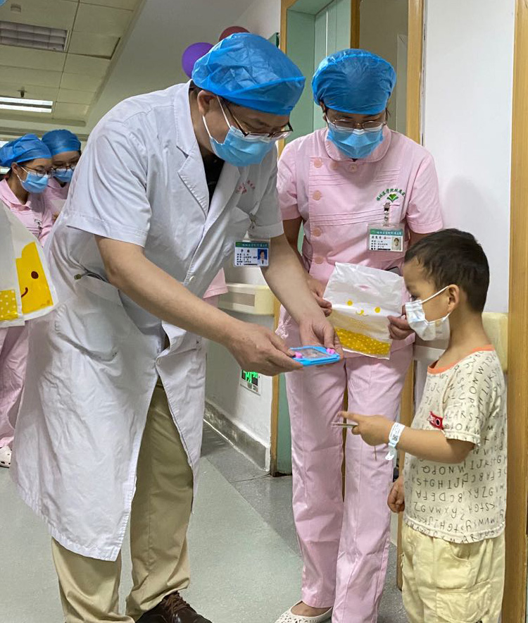 早接班期间,科室负责人岳毅刚与科室护士长闫秀兰及医护人员携带气球与礼物逐一问候小朋友们,并亲自给小朋友们送上真挚的问候与节日的礼物,共同为孩子们庆祝“六一儿童节”。