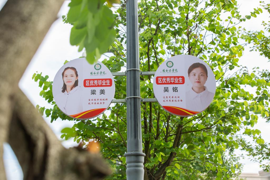校园道旗增新颜,榜样学子展风姿。桂医优秀学子、国家奖学金获得者、区优秀毕业生共67名榜样学子的道旗展示,彰显了大学生朝气蓬勃和奋发向上的精神,实现了良好学风氛围营造与校园文化建设的有机融合,凝聚着浓厚的大学精神和人文气息,成为思想政治教育的“新名片”,引来桂医师生驻足观看。