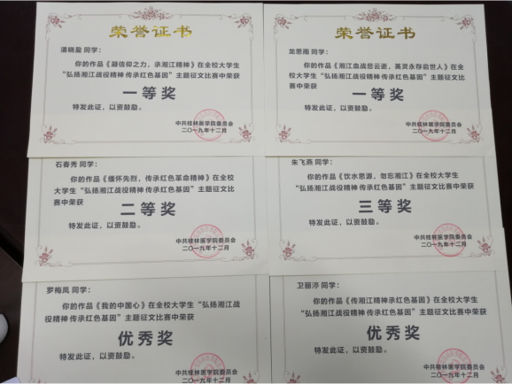 为深入学习贯彻习近平新时代中国特色社会主义思想和党的十九大精神,激励引导青年学生缅怀革命先烈,弘扬湘江战役精神,传承红色基因,护理学院积极响应、认真组织学生参加全校大学生“弘扬湘江战役精神 传承红色基因”主题征文比赛。经学校组织评选,护理学院学子在比赛中取得得佳绩,荣获一等奖2篇、二等奖1篇、 三等奖1篇、优秀奖2篇。