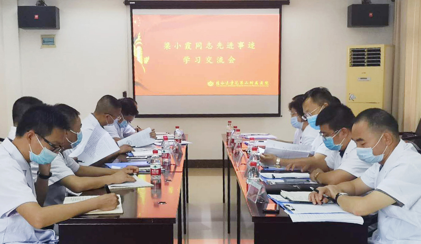 党委书记文琼仙向大家传达了《中共广西壮族自治区委员会关于在全区党员干部中开展向梁小霞同志学习活动的决定》、《中共广西壮族自治区委员会组织部广西壮族自治区人力资源和社会保障厅关于给予梁小霞同志追记大功的决定》、《自治区卫生健康委关于在全区卫生健康系统开展向梁小霞同志学习活动的通知》等文件精神。与会同志们认真学习了梁小霞同志的先进事迹报道并进行了积极讨论。大家纷纷表示,梁小霞同志积极响应党中央号召,主动请缨奔赴湖北抗疫前线,毫无畏惧投入疫情防控救治工作,在工作中勇于担当,用自己的生命践行着初心和使命,展现了当代医务工作者的精神风貌和时代风采。