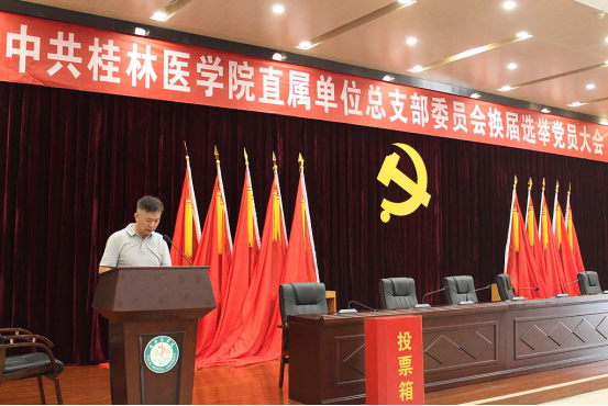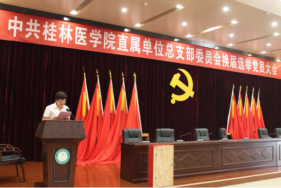 直属党总支黄健书记代表中共桂林医学院直属单位总支部上一届委员会作了题为《不忘初心开拓进取,牢记使命锐意创新,积极开创直属单位团结和谐稳定进步新局面》的工作报告。直属党总支蒋海萍副书记主持会议。直属党总支纪检委员高东同志致开幕词。直属党总支全体共产党员出席会议。直属单位各部门党外中层干部和分工会主席作为特邀嘉宾列席会议。