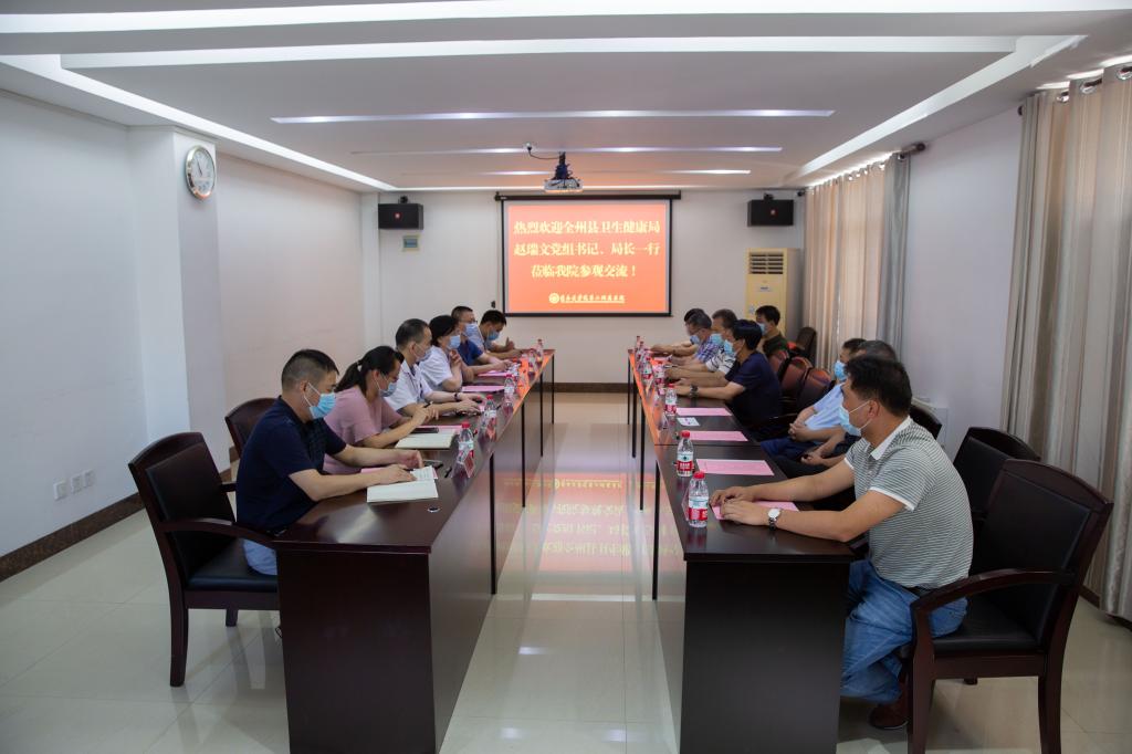 7月24日,全州县卫生健康局局长赵瑞文、副局长杜铁军,全州县人民医院院长唐雨发一行11人来到第二附属医院,交流放射科对大型设备的使用和管理经验,为全州县医疗系统未来的仪器采购做准备。第二附属医院党委书记文琼仙,副院长夏中华、刘洪波及相关职能科室负责人在后勤综合楼六楼会议室参加了座谈会。