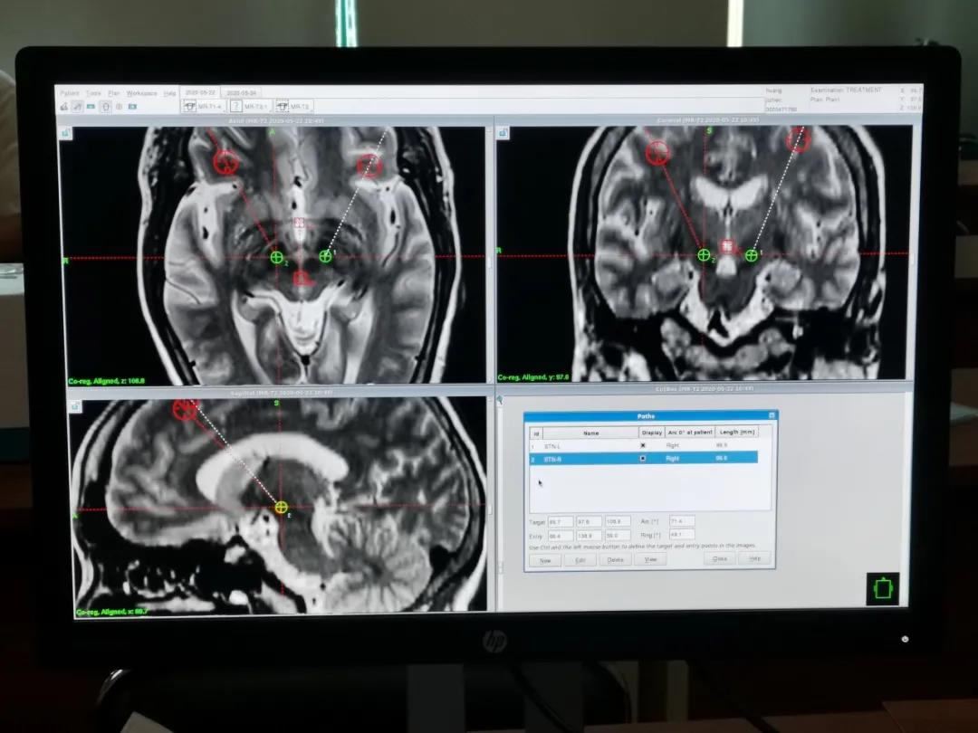 一切术前检查都进行的很顺利,手术当天廖红展博士团队为黄女士上头架、定位坐标点核磁共振扫描的很清晰,标记靶点,确定电极植入的角度,从手术步骤看,直接在人脑上的操作,只有一个步骤,就是植入电极的过程,其他的都是在皮肤下面。