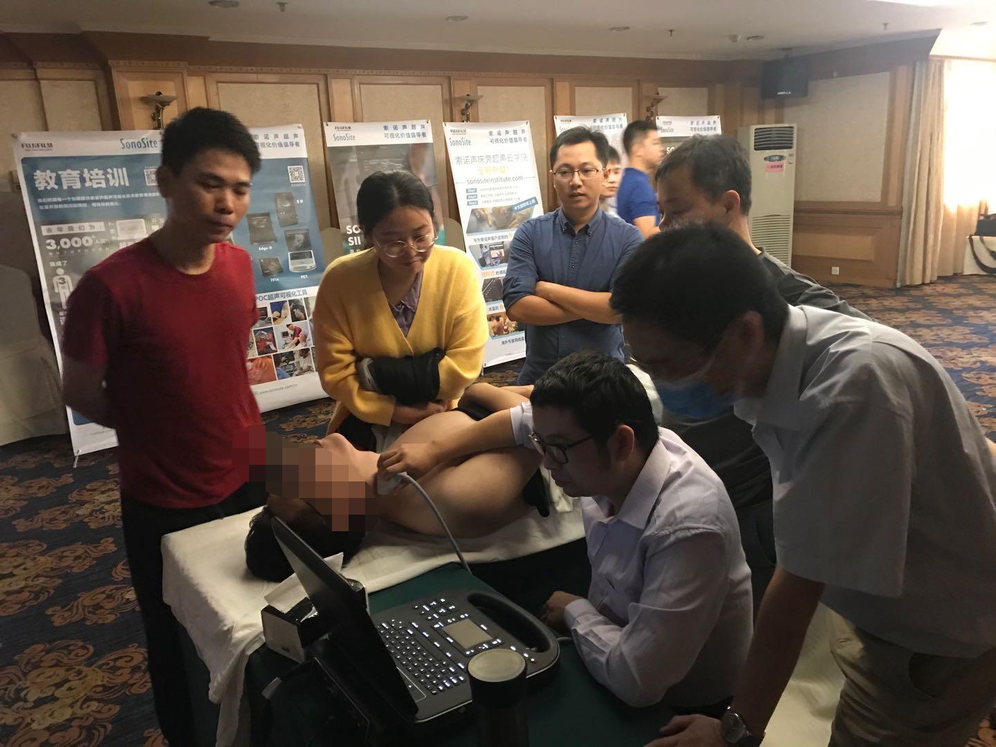 随后,20余名学员进行“超声Workshop”培训,这项培训由公维义主持。桂林医学院第二附属医院疼痛科袁振宇医师、我院疼痛科俞振华医师和邓彦博医师分别对颈椎旁、胸椎旁、腰椎旁超声进行理论和操作授课,并留给学员充分时间操作和提问。