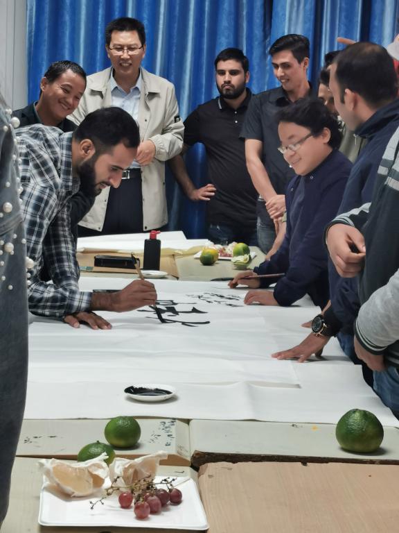 热闹喜庆的节日气氛感染了在场每一位留学生。在活动最后,辅导员王长亮老师在宣纸上书写了“欢度双节”的书法作品,带领在场的所有留学生一起通过书法这一特殊的中国传统文化表现形式,向家人、朋友以及学校的领导老师们表达节日的祝福,祝愿中国以及桂林医学院的未来越来越美好!