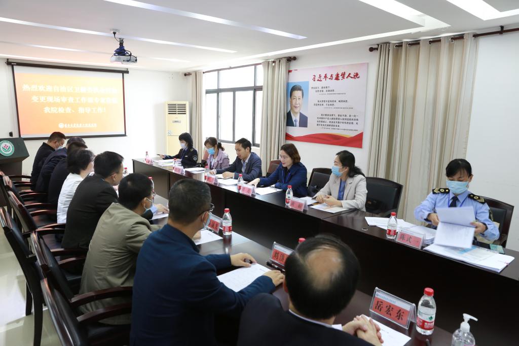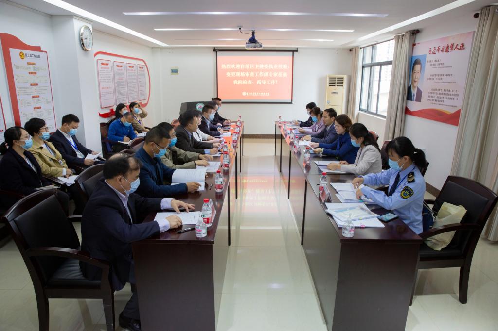 10月15日上午,自治区医疗机构专家组一行6人在领队钟力、组长覃莲的带领下对第二附属医院进行执业校验现场审核检查。医院党委书记文琼仙、院长葛波等领导班子成员及相关部门负责人参加汇报会。