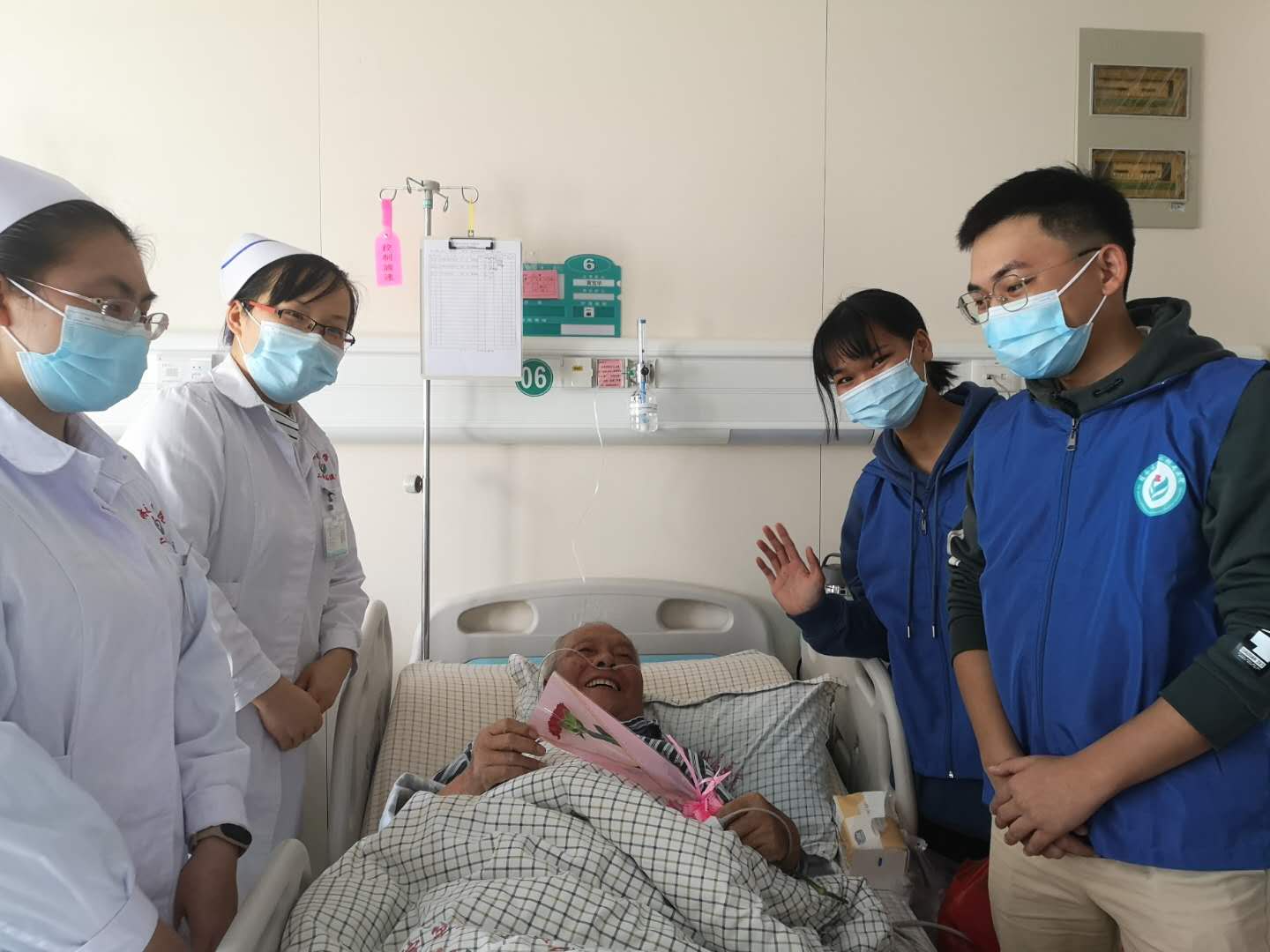 活动期间,社工和医务人员为因重病不能下床参加活动的病人送上了鲜花,致以节日慰问和祝福,老人们连声感谢,主动邀请他们一起拍照。