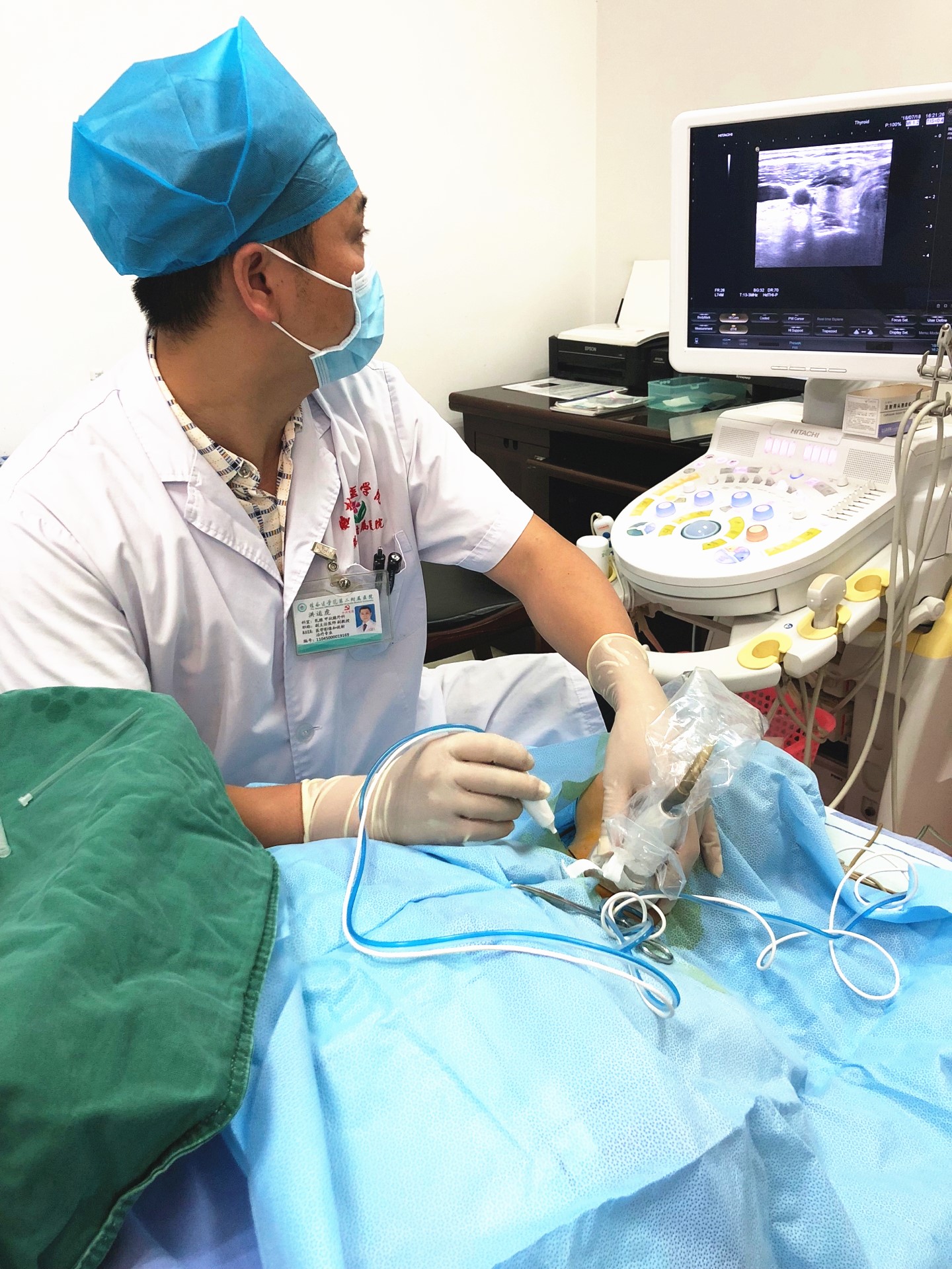 2020年5月19日,经周密准备,由科室专长此技术的超声介入专家洪运虎副主任医师及黄仁相主治医师实施操作。手术在局麻下进行,在高端彩超的引导下,使用韩国STARmed射频消融系统的专用消融针,将针尖准确穿刺到肿块里,采用多点移动射频消融技术(MovingShot),首次就消融了70%左右的肿块。