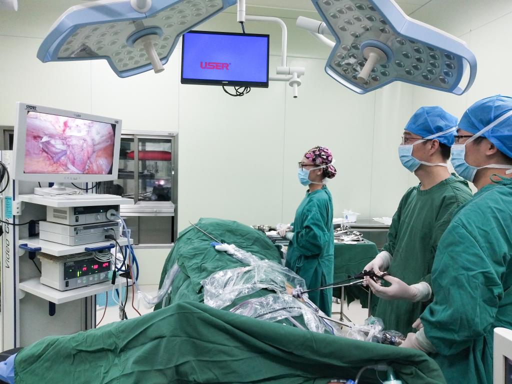 胃肠外科的专家们针对程奶奶的情况拟定了腹腔镜造口旁疝修补手术方案,并详细讨论了术前准备事项和术中要点。9月21日,在陈伟副教授的指导下,艾常华副主任医师和李皓医师施行手术。医护人员首先在腹壁开3个小孔,然后将腹腔镜探入患者体内,经过2个小时娴熟的操作,手术顺利完成。