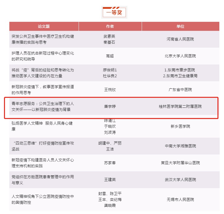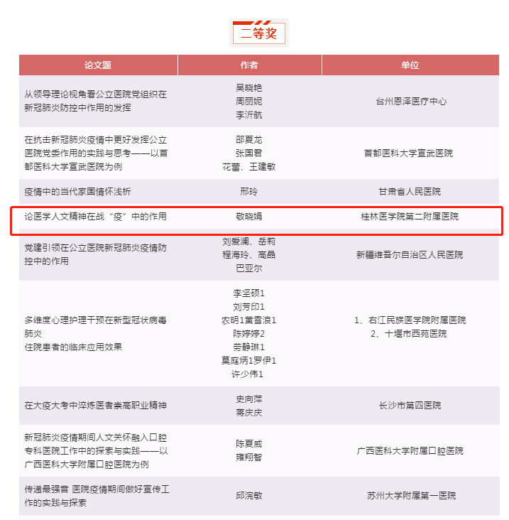 11月2日,中国医院协会医院文化建设委员会公布2020年“抗击新冠肺炎疫情中的医学人文精神”征文获奖名单,第二附属医院在全国各级医疗单位机构脱颖而出,获得一等奖1篇和二等奖1篇,获奖数量和质量居广西最优。其中,唐宇婷的“青年志愿服务:公共卫生治理下的人文关怀——以新冠肺炎疫情为背景”荣获一等奖;敬晓娟的“论医学人文精神在战‘疫’中的作用”荣获二等奖。