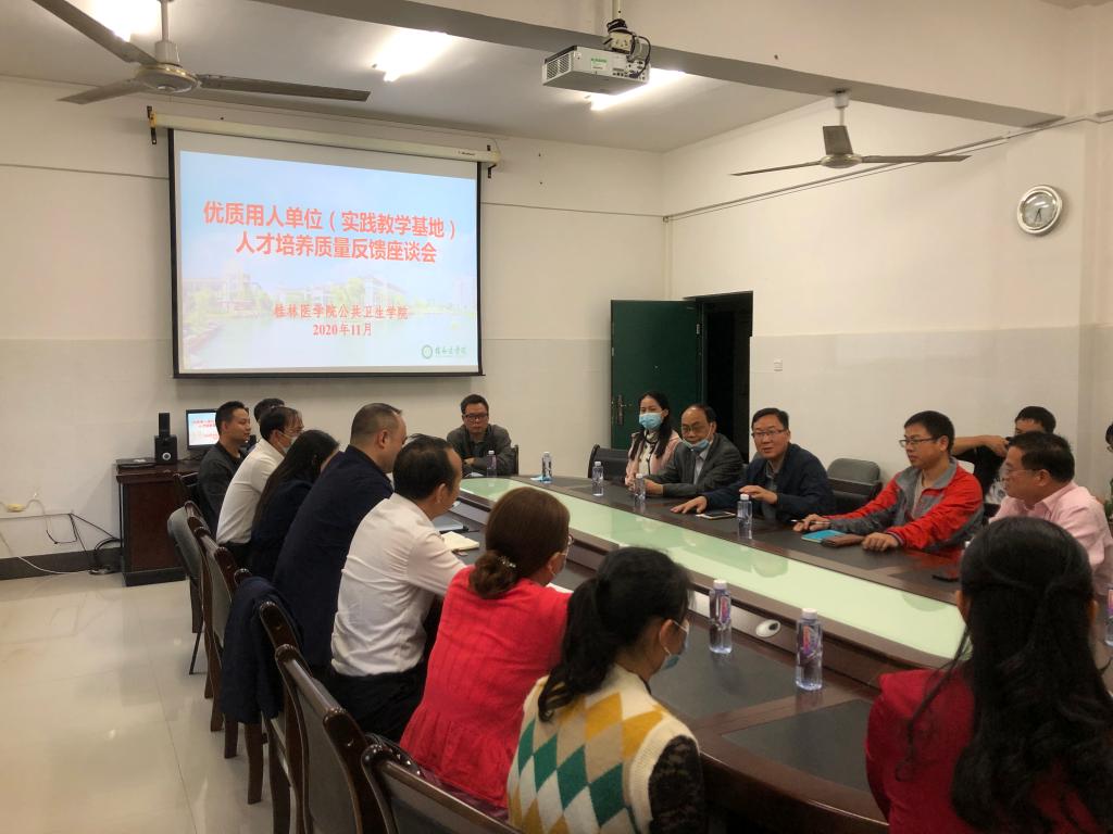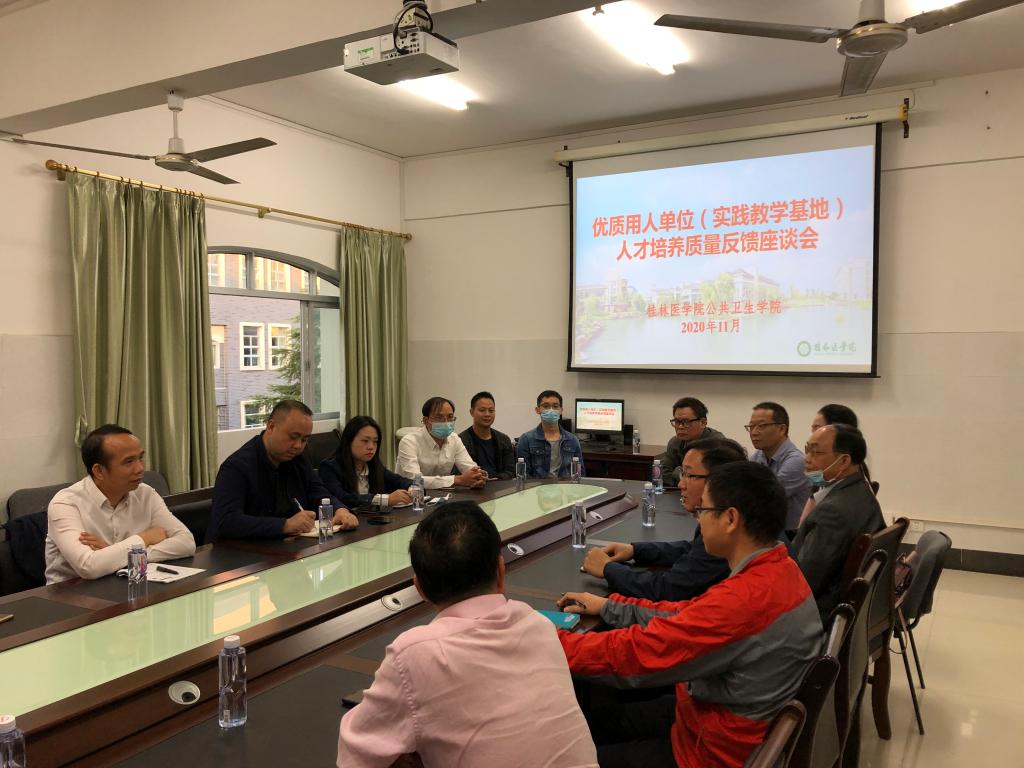 谭盛葵教授代表学院对受邀参加座谈交流的单位表示热烈欢迎,感谢各用人单位多年来对公共卫生学院的关注、对学院学生培养等工作的支持。他表示:希望通过此次与各用人单位、实践教学基地的现场座谈交流,能真真切切、实事求是地听到各用人单位、实践教学基地对我院在人才培养、毕业生工作状况、实习生情况的真实反馈,为进一步完善、优化学院人才培养方案,提升我院“人才产品”出品质量做好铺垫。会上,玉林、贵港、贺州等多家疾病预防控制中心参会领导对我院学生的专业素质、综合素养都给予高度评价,同时也指出与同类院校学生相比所存在的一些具体问题,并提出相关专业意见和建议;湖南山水大健康咨询有限公司参会代表对其企业情况进行详细的介绍,积极表示与我院能在学生社会实践教育、实习培养、就业等方面开展长远、深度合作的意愿。