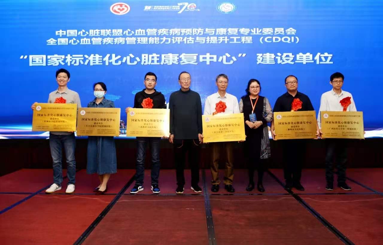 会上,中国心脏联盟主席、中国康复医学会心血管疾病预防与康复专业委员会主任委员、北京大学人民医院心血管病研究所所长胡大一教授为广西十八家国家标准化心脏康复建设单位授牌。