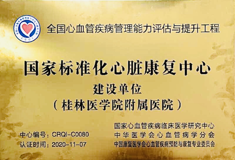 附属医院是广西首批“国家心血管疾病管理能力评估与提升工程”(CDQI)国家标准化心脏康复中心建设单位,是中国心脏联盟心血管疾病预防与康复专业委员会广西联盟副主委单位,是桂北地区首家CDQI国家标准化心脏康复中心建设单位。