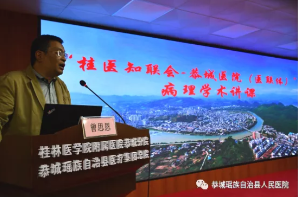 恭城县人民院领导班子召集各科室负责人以座谈会的形式向知联会专家介绍了恭城县人民医院作为我校附属医院医联体的建设情况,双方对医技互助、临床研究、医院管理、医保改革等方面展开了热烈讨论和交流。下午,我校附属医院病理科的两位专家作病理学主题讲座。