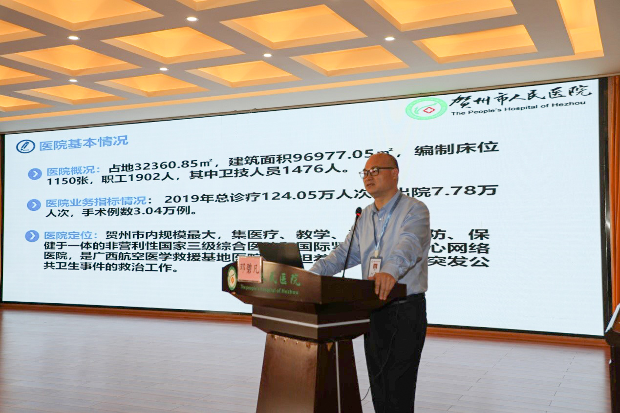 播放贺州市人民医院宣传片后,邓碧凡通过幻灯片形式从医院“三甲”创建工作、创建方法、评审资料准备、现场评审迎检、取得成效等方面展开详细地介绍。