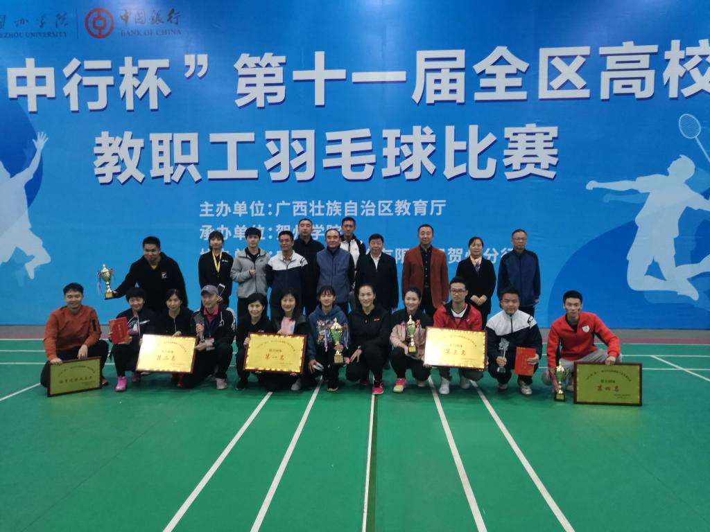 为加强各高校之间的沟通交流,丰富校园体育文化生活,促进高校教职工身心健康发展,广西教育厅于11月24至27日在贺州学院举办第十一届全区高校教职工羽毛球比赛,我校15名教职工运动员在校工会精心组织下参加了此次比赛。