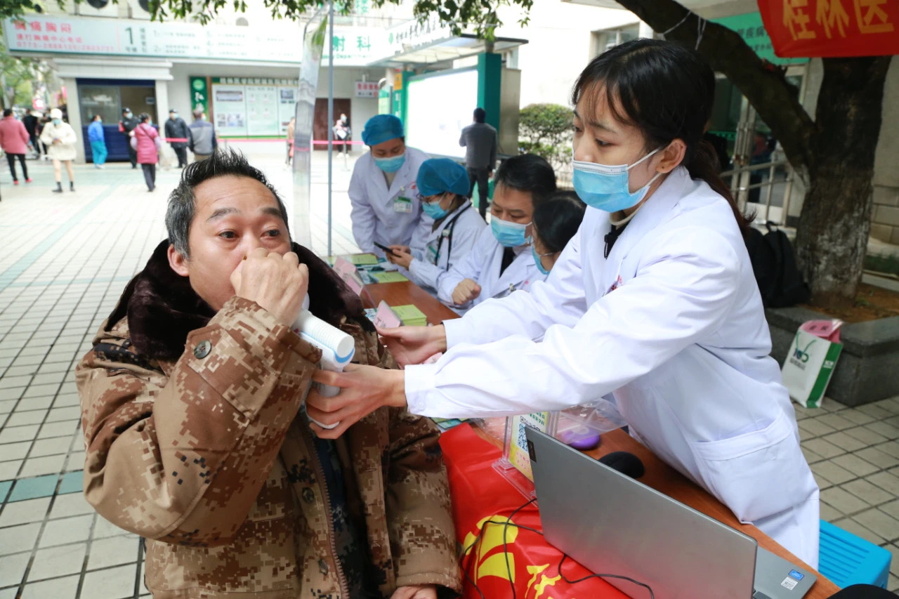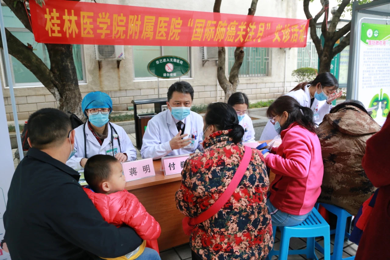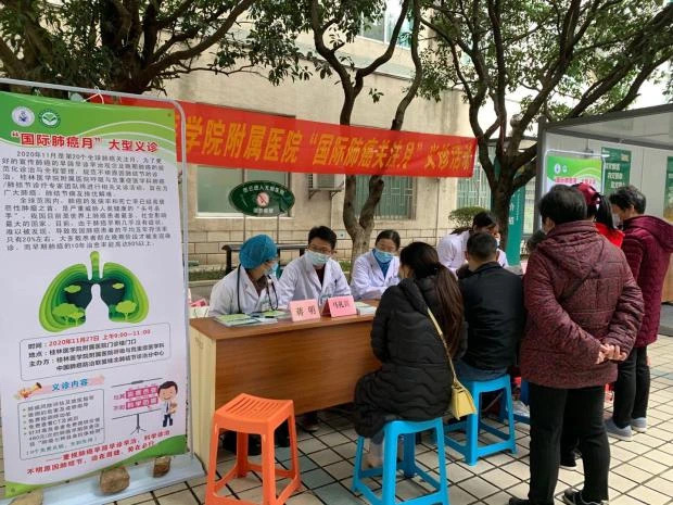 附属医院呼吸与危重症医学科的马礼兵、蒋明、罗淼、陈峰、周燕、王绩英、韦江红及核医学科付巍等专家参加了活动。专家们现场向大众进行肺癌的早筛早诊早治观念及晚期肺癌的规范化诊治与全程管理,规范不明原因肺结节的诊治的科普知识宣传,劝导吸烟患者及时戒烟,让老百姓了解肺癌,消除对肺癌的恐慌心理,让需要治疗的肺癌患者得到早期规范化的诊疗。并免费为市民做肺功能筛查,为高危肺结节患者做肺癌七项自身抗体筛查。
