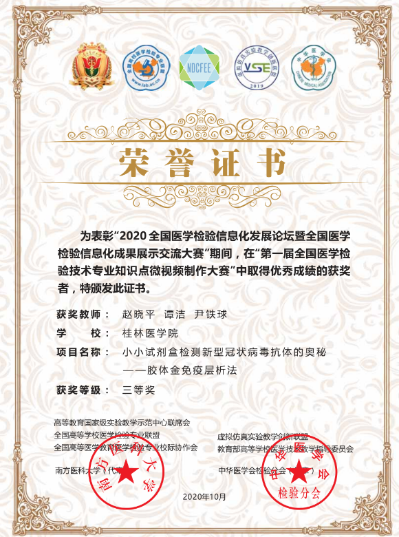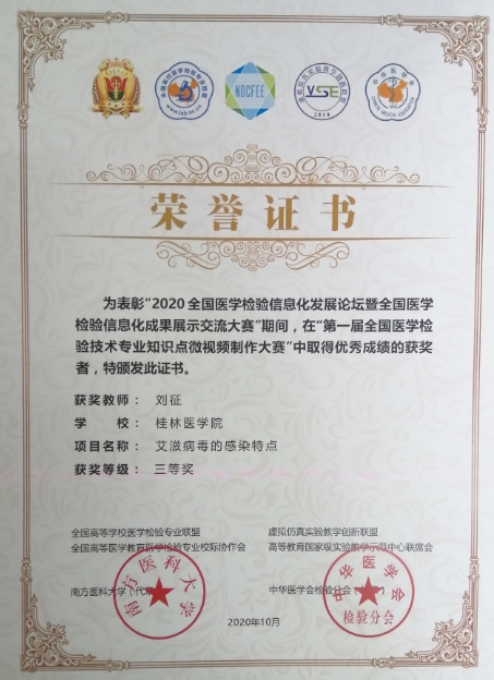 时维暮秋,举盛事于南粤;检验良师,折蟾桂于珠海。 近日,“第一届全国医学检验技术专业知识点微视频制作大赛”于珠海举行。医学检验学院赵晓平、刘征两位教师分别以“小小试剂盒检测新型冠状病毒抗体的奥秘”和“艾滋病毒的感染特点”作品获得比赛三等奖。
