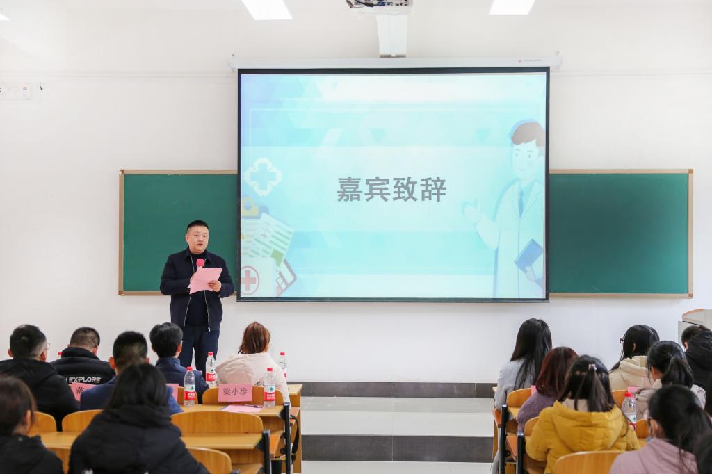 王海鹏致开幕词,他希望通过此次大赛一方面更好地“以赛促学”,给同学们提供一个切磋技艺、展示水平的平台,营造勤学勤练临床技能的的良好氛围;另一方面“以赛促教”,促进临床技能教学的发展,提高教学质量。要求裁判和工作人员坚持公正、公平、公开的原则,确保本次比赛顺利进行,同时也希望各位参赛选手充分发挥自己的学识才能,以良好的心理素质赛出水平,赛出风格。