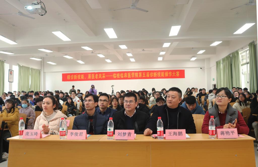 为进一步规范临床教学体系,推动临床教学改革与发展,提升医学生创新能力、实践能力和团队合作意识,全面提高医学生人才培养质量,展示医学生临床风采。12月5日,临桂临床医学院于在大学生活动中心成功举办第五届诊断技能操作大赛决赛。第二附属医院、临桂临床医学院党委副书记刘梦青、副院长王海鹏、教学管理部科长李俊君,临桂临床医学院学工办主任蒋艳平、学工办全体辅导员、各班班主任及学生代表近200人观摩了本次比赛。大赛裁判团由第二附属医院各科室医生代表共11人组成。