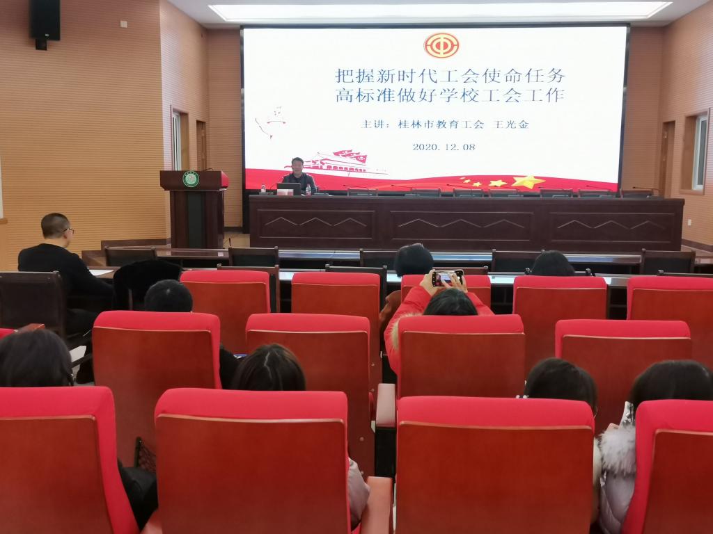 随后由桂林市教育工会主席王光金,为我校工会干部开展了以“认清新时代工会使命任务,高标准做好工会工作”为主题的讲座,讲座中王光金首先详细的讲解了习近平总书记对工会工作的重要论述,随后带领大家学习了《中共中央关于加强和改进党的群团工作的意见》,最后对如何提升工会干部岗位能力进行了培训。