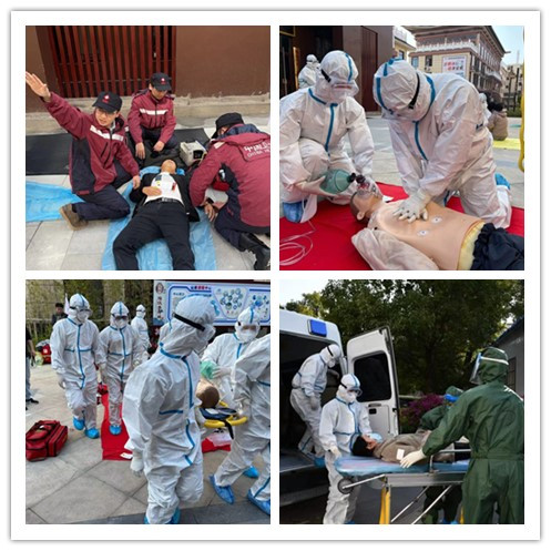 演练中模拟了在一起重大交通事故,多人在车祸中受伤,来自附属医院紧急医学救援队的15名救援人员集结后,按疫情规范实施三级防控,快速到达事故现场。在附属医院救援队总指挥(医务部副主任)黎宗毅、副总指挥(急诊创伤外科副主任)张磊的指令下,准确检伤分类、重点伤员优先处置、危重伤员紧急转运,整个决策和流程中,救援人员分工协作、有条不紊。伴随着120的警笛声,紧急转运的恭城县人民医院救护车,迅速将3名伤员送至恭城县人民医院发热门诊及急诊科,在转运和交接过程严密实施防控措施。附属医院感控科胡长玉副主任护师全程跟随整个演练过程,对演练过程中的院感控制等方面做出精细点评,并再次培训了如何正确穿脱防护服。