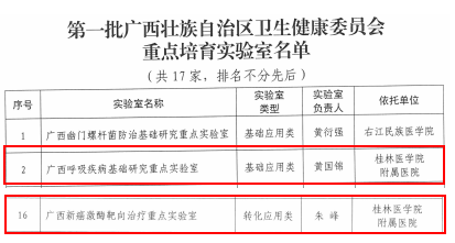 其中,获批为自治区卫健委重点实验室的分别为由李清华教授带队建设的“广西神经系统疾病大数据智能云管理重点实验室”;由牛华教授带队建设的“广西神经鞘脂代谢相关疾病基础研究重点实验室”。获批为自治区卫生健康委员会重点培育实验室分别为由黄国锦研究员带领的“广西呼吸疾病基础研究重点实验室”,由朱峰教授带领的“广西新癌激酶靶向治疗重点实验室”。这是附属医院(临床医学院)重点实验室建设取得的重大突破!