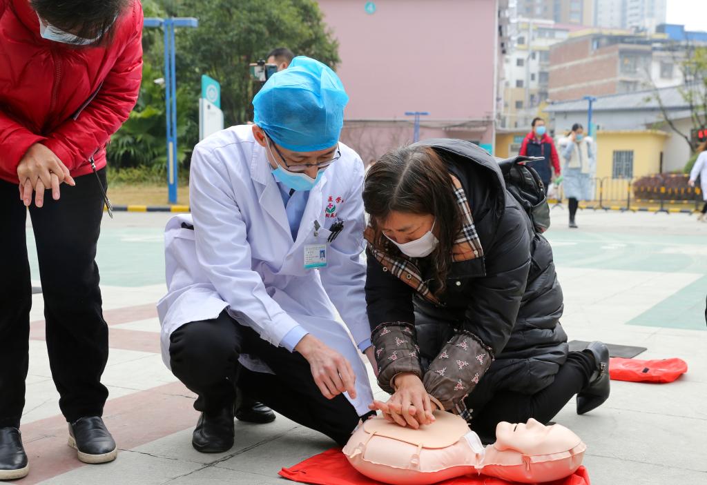 12月24日上午,第二附属医院六号楼广场上,医院心血管内科和急诊科联合举办的“救心降临”——心肺复苏“CPR急救”培训正在进行。医院副院长夏中华出席了此次活动。