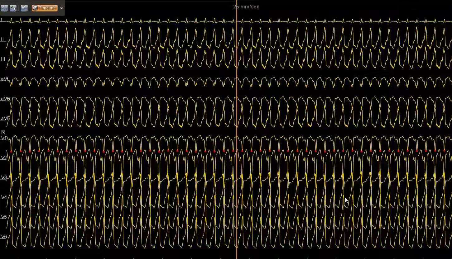 患者为老年女性,有多年的阵发性室速的病史,发作时有明显的心悸、乏力和黑曚症状,但去到医院就诊时室速就自行终止了,去年在手术室中反复行电生理检查也未能诱发。