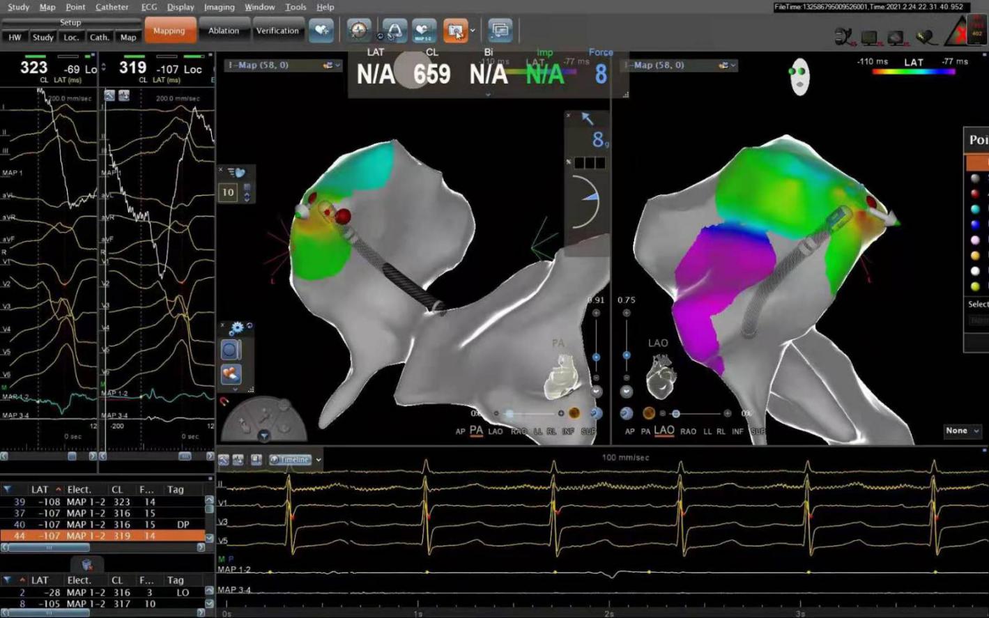 术中在备好电复律的情况下,在很短的时间内精准标测到室速起源点,放电消融后终止室速,巩固消融后将室速的起源点彻底根除,患者24小时内即顺利办理了出院。