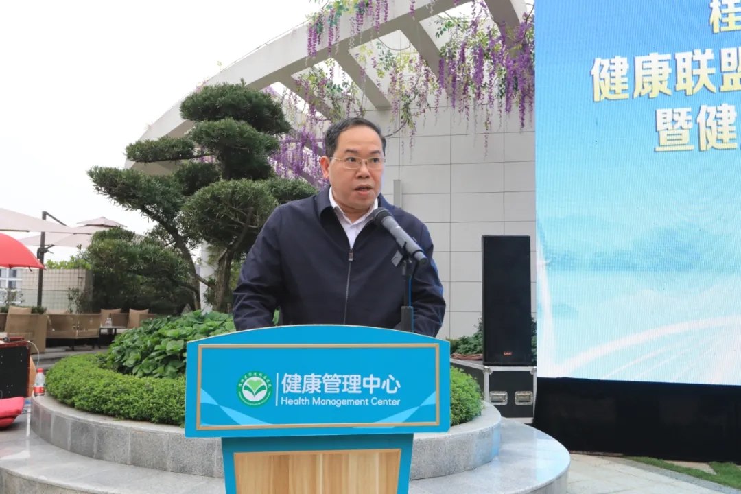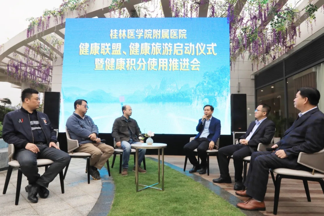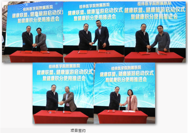 蒋伟、李堂炜分别致辞。蒋伟说,我们推出健康联盟和健康旅游项目,旨在搭建合作平台,把健康服务和金融、旅游等产业进行融合,为大家提供更为优质的医疗及健康管理服务,为桂林市健康旅游、大健康服务做出新的更大的贡献。李堂炜说,桂林医学院附属医院健康管理(体检)中心主动作为,合作推出健康旅游项目,启动医疗、旅游、商务等健康联盟,为市民、游客和高端商务人士提供更完善的健康管理服务,必将为桂林市的健康旅游产业创新发展格局做出重要贡献。