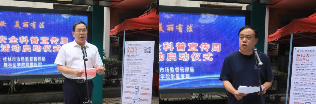 蒋伟致辞。他说,“5.25全国护肤日”是由中国医师协会皮肤科医师分会倡议设立的全国性公益护肤日,旨在通过活动,指导人们科学护肤,预防皮肤病的发生。今天是第十五个“5.25全国护肤日”,为响应中国医师协会皮肤科医师分会的号召,桂林市市场监督管理局和桂医附院携手共同举办科学护肤、化妆品安全知识义诊宣传、科普讲座等活动,希望通过此次活动加强群众对皮肤健康的意识,让群众深刻认识皮肤健康的重要性,树立选择专业医生进行护肤咨询的正确观念,为建设健康桂林、健康广西做出应有的贡献。