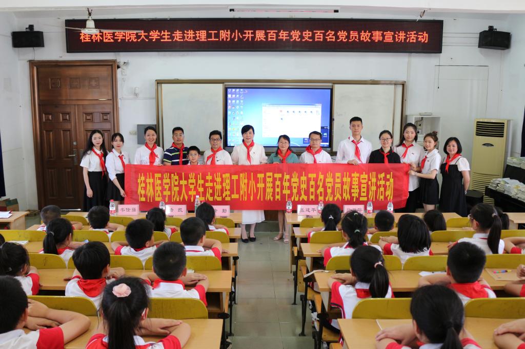 在庆祝中国共产党建党100周年之际,6月7日下午,我校5名大学生走进理工附小开展百年党史百名党员故事宣讲活动,学校创新创业教育学院和马克思主义学院主要负责人、桂林理工大学附属小学校长参加本次活动。