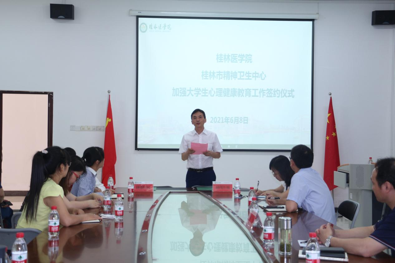 6月8日上午,桂林医学院与桂林市精神卫生中心在大学生活动中心409进行了加强学生心理健康工作合作项目的签约仪式。我校学生工作处处长胡友根和桂林市精神卫生中心副院长刘军分别代表桂林医学院学生工作处与桂林市精神卫生中心签署合作协议。我校学生工作处负责人,学工干部、全体专兼职辅导员、专兼职心理健康教育教师及专兼职心理咨询师出席了签约仪式。