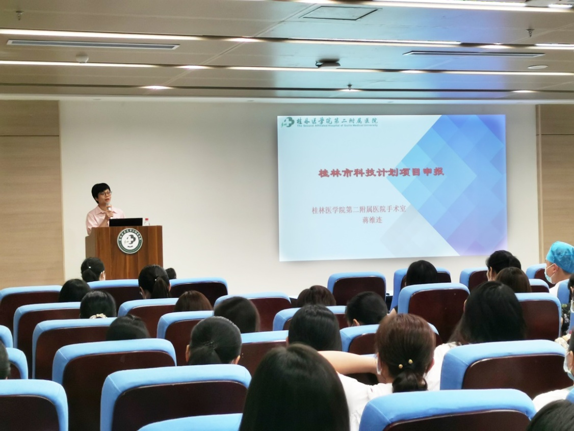 本次专题讲座由第二附属医院手术室副护士长蒋维连副教授作为主讲。他为学员们作了题为《桂林市科技计划项目申报》的专题讲座,提出科研反哺临床的观点,充分展现了临床与科研的紧密关系。他结合自己多年在科研领域积累的经验和丰富的阅历,从项目选题、项目申请理由、项目总体目标、主要内容和考核指标、研究基础与工作条件及项目申请书中常见的错误等多个方面为切入点进行详细论述,授课内容详实、干货满满。现场的护理人员们都全神贯注、认真聆听,详细地记录每个要点,学习氛围浓厚。