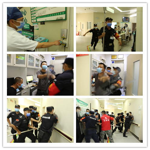 现场情景模拟急诊科医护人员发现两名男子手拿刀具欲对其科室人员进行攻击,及时按下一键报警按钮,中心控制室接警后,立即通知岗亭两名安保人员,他们手拿警叉及警盾迅速赶到现场与两名男子周旋,并同时向110报警和呼叫院内其他人员支援。