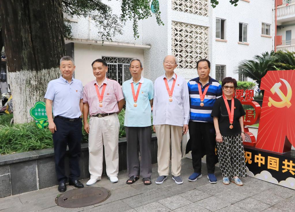 在离退办公室,医院党委书记宋剑非和灵怀、蒋步源、张泽、陈景澄、覃火护5位老党员促膝而谈。老党员们对医院和领导的关心表示感谢。宋剑非说,5位同志都是超过50年党龄的老党员,是医院建设发展的贡献者和见证人,你们为医院的健康、快速发展打下了坚实的基础,希望各位老同志继续为医院的发展建言献策。随后,他为5位老党员带上了“光荣在党50年”勋章,并向他们致敬,祝愿他们节日快乐、身体健康!