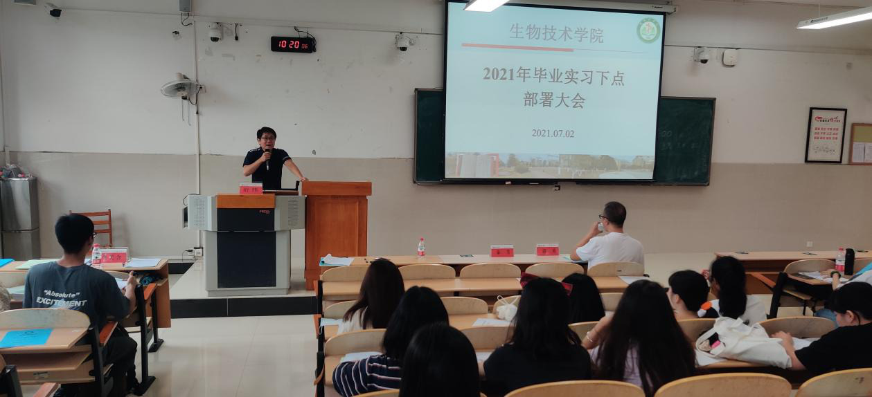 本次动员大会旨在明确实习目标,解读各专业实习流程,强调实习安全和纪律要求。会上,秦芳强调,要正确认识实习这一重要学习环节,提前做好思想准备,重视组织纪律和安全工作,遵守实习单位相关规定,学会做人做事,锻炼新技能,掌握新本领。李美含对生物技术学院生物技术本科、生物医学工程本科和生物技术专科三个专业的实习要求、实习手册作了详细解读。郭勇殷切嘱咐即将下点实习的学生:一要明确实习任务,认真完成毕业论文;二要遵守纪律,注意安全;三要在社会中体会人情世故,关照彼此,共同成长。舒伟作大会总结,重点强调了实习生要注意提高沟通能力和培养学徒精神。